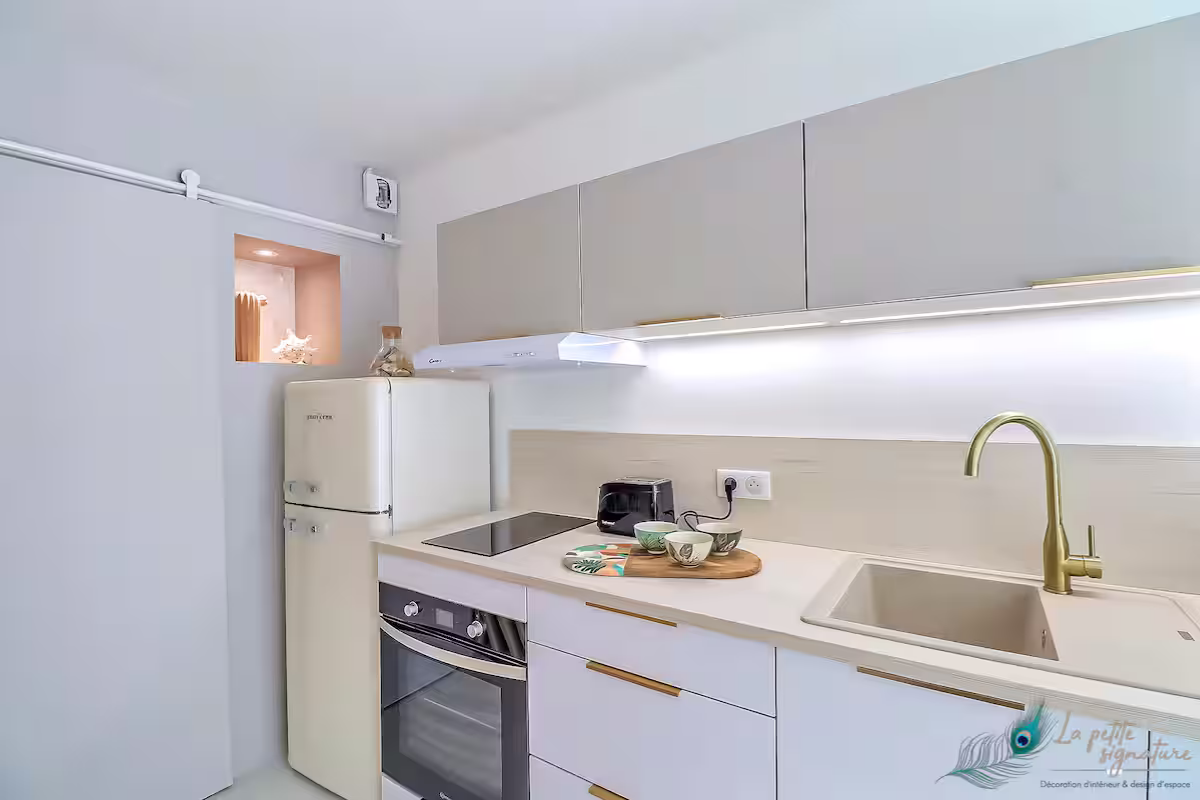 Il y a un lave vaisselle et un lave linge, four et micro onde, cafetière Nespresso, TV 4 k grand écran