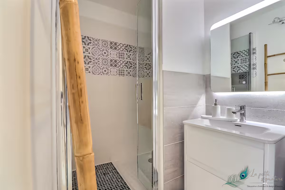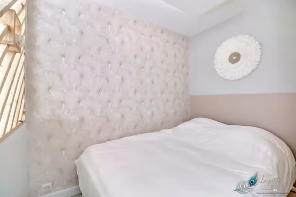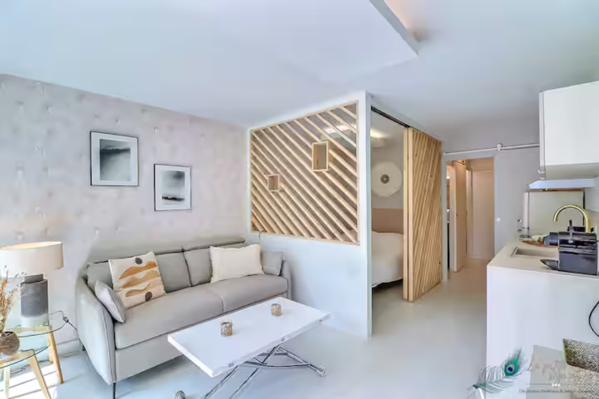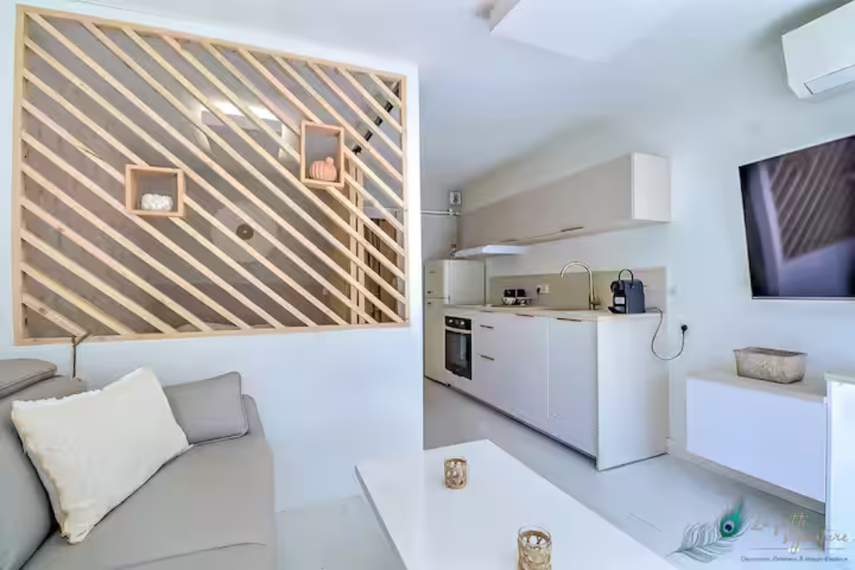 Le studio est très fonctionnel avec un lit double confortable séparé de la pièce de vie par un claustra. La salle de bains et les wc sont séparés.